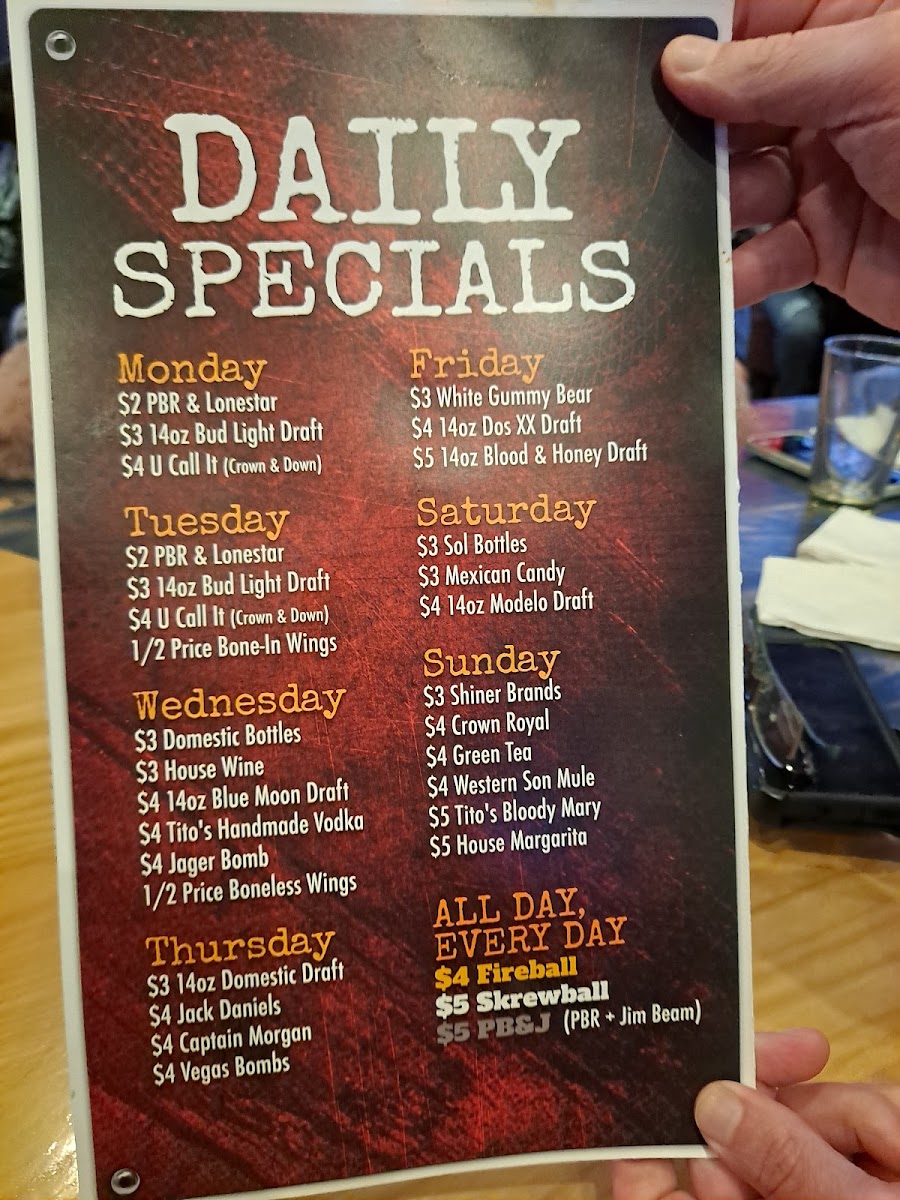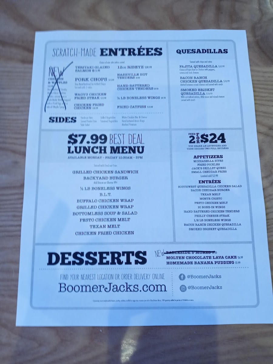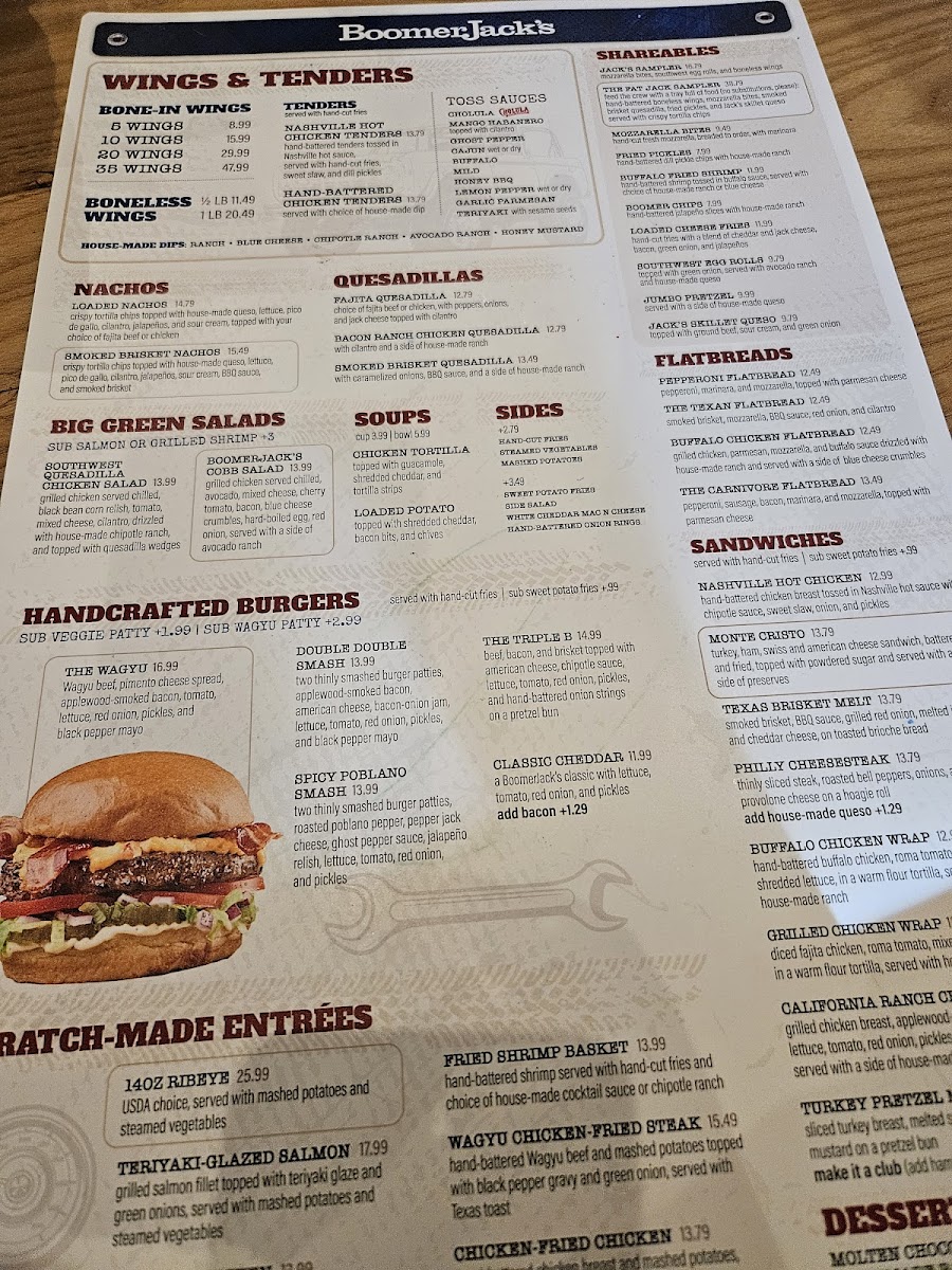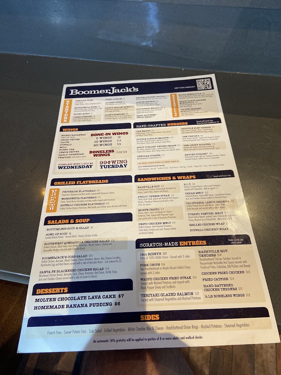 Choose any three: Loaded Potato Skins, Boneless Wings, Mozzarella Bites, Fried Pickles, Boomerchips, or Southwest Chicken Eggrolls.