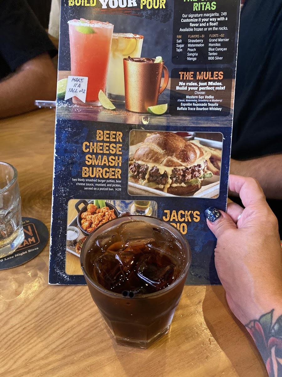 two thinly smashed burger patties, beer cheese sauce, mustard, and pickles served on a pretzel bun.